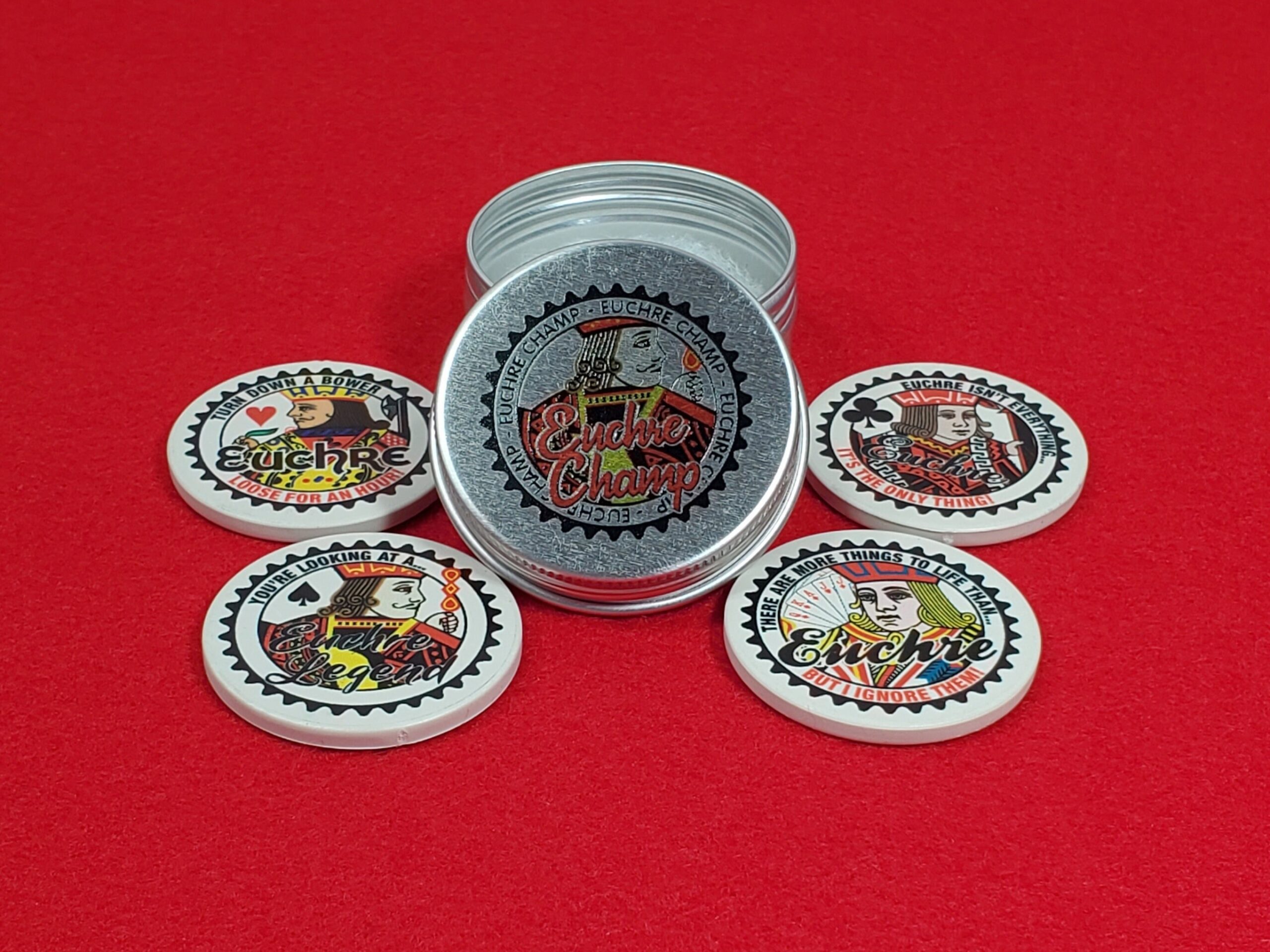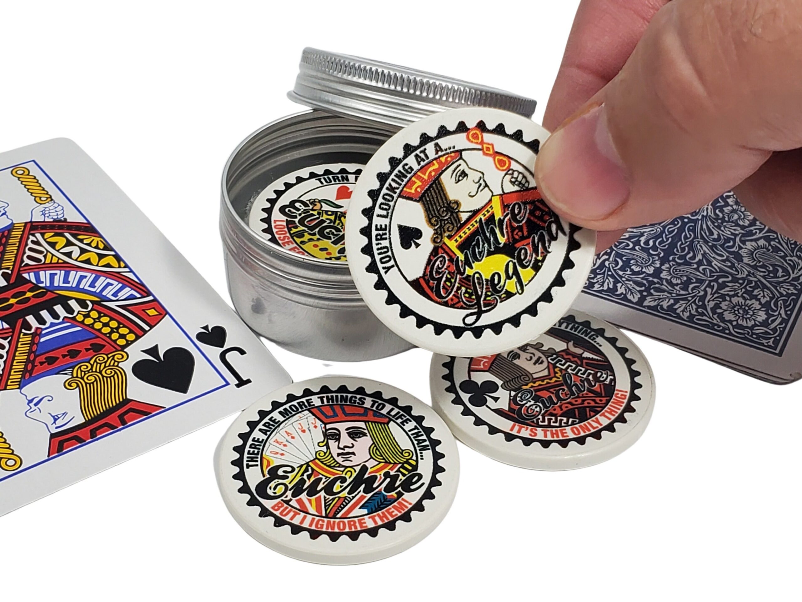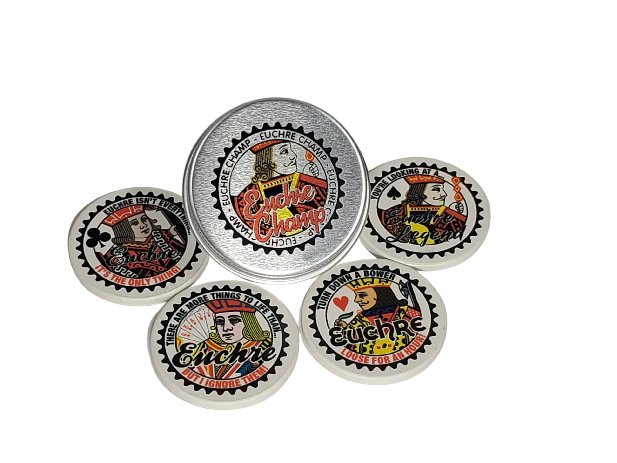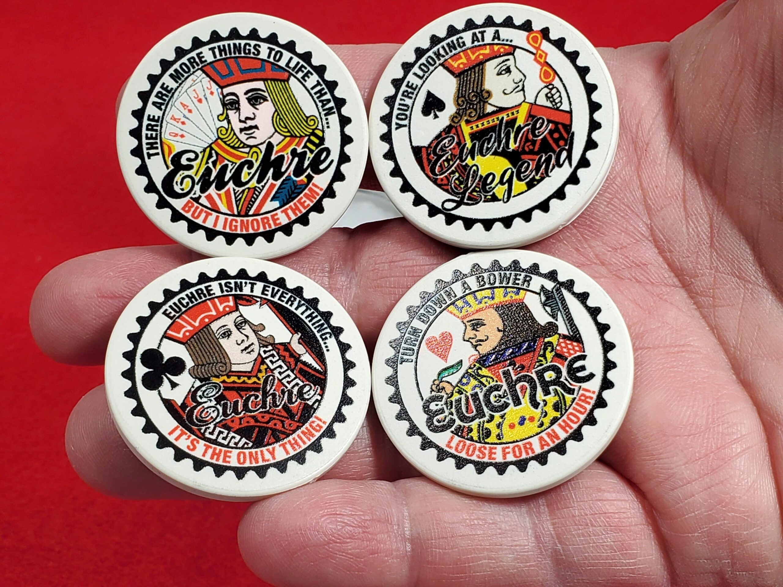 Great gift idea for the euchre fan in your life, or even as an award for an euchre tournament. Set includes 4 ceramic poker chips with popular euchre sayings like: