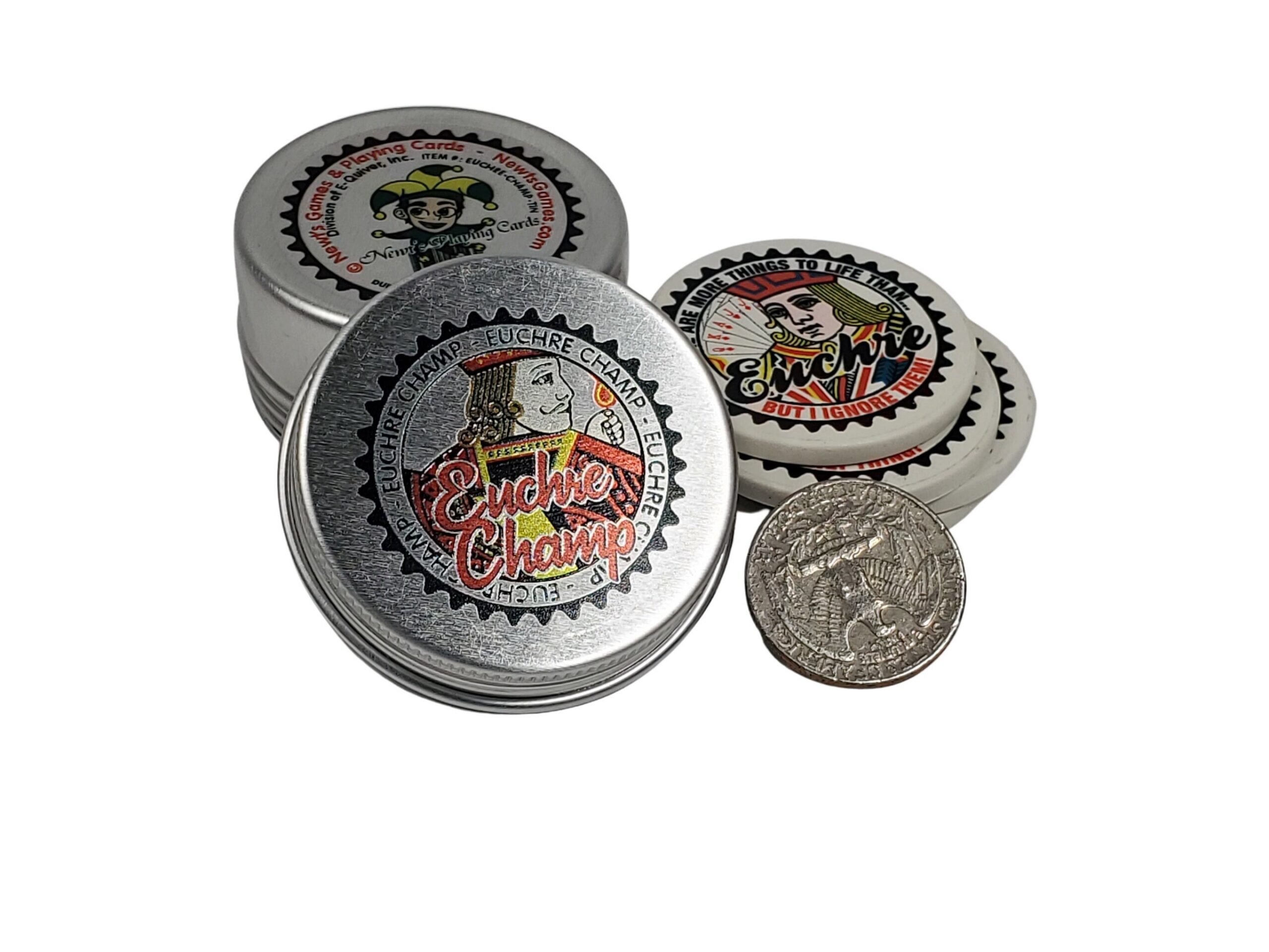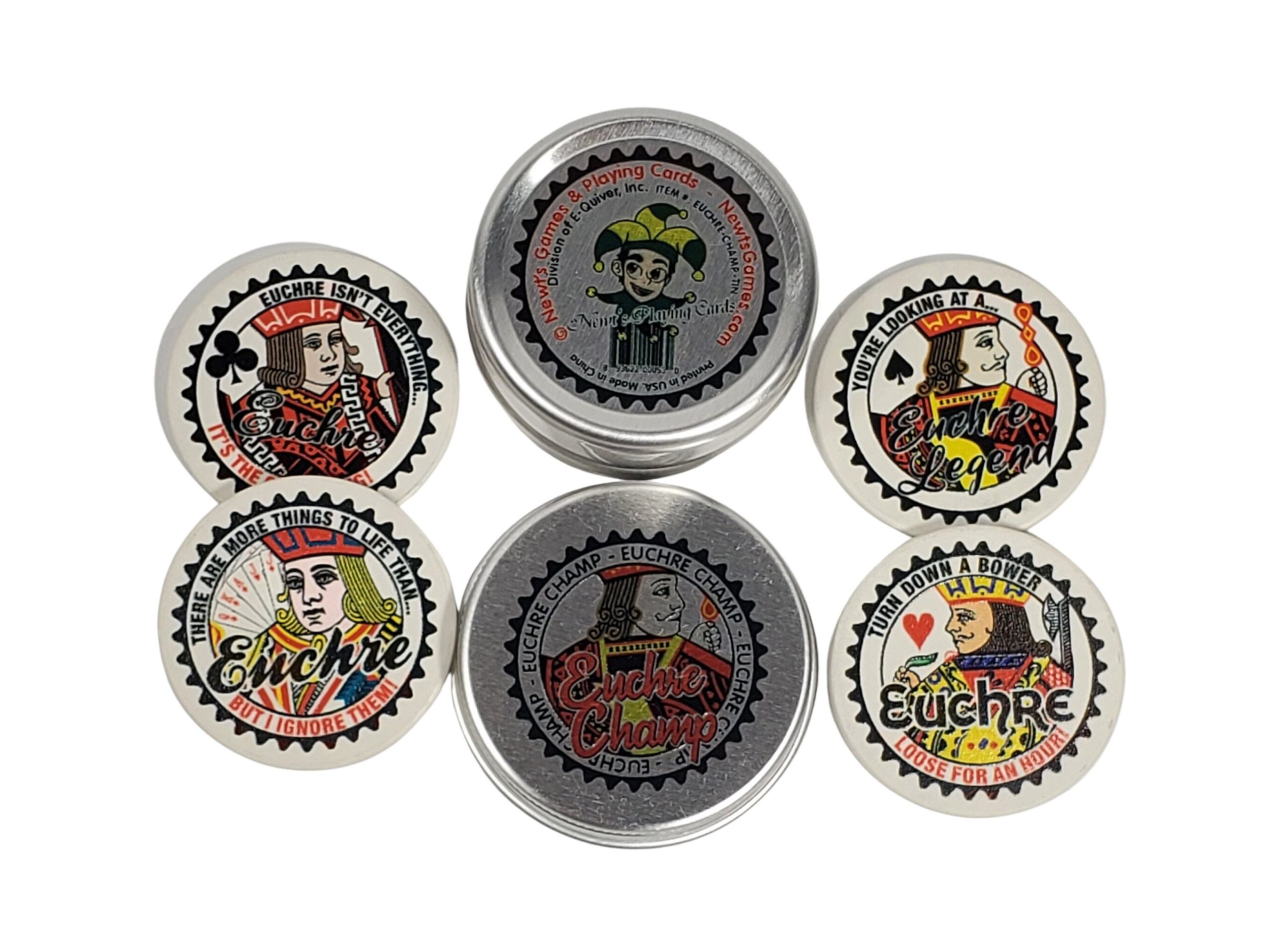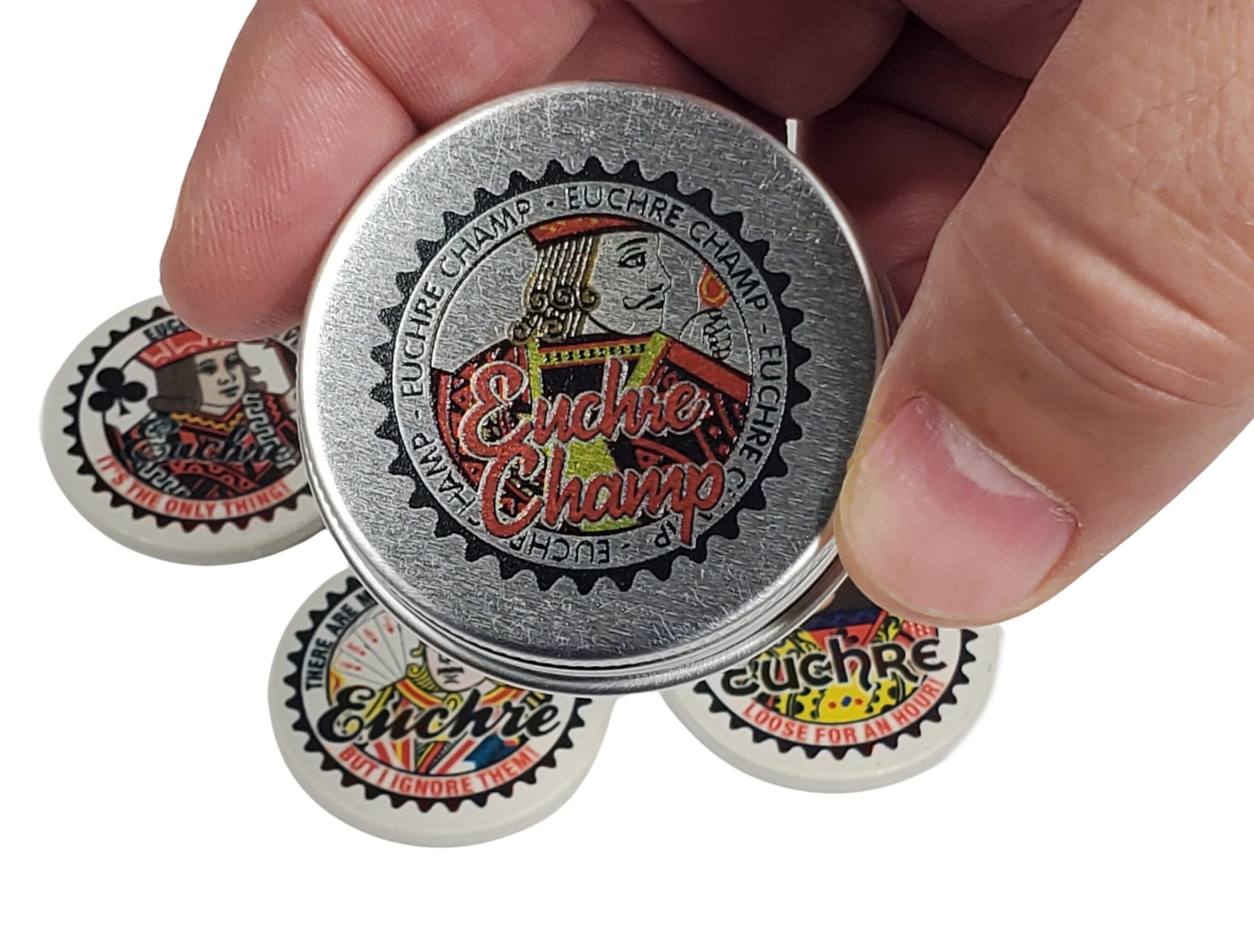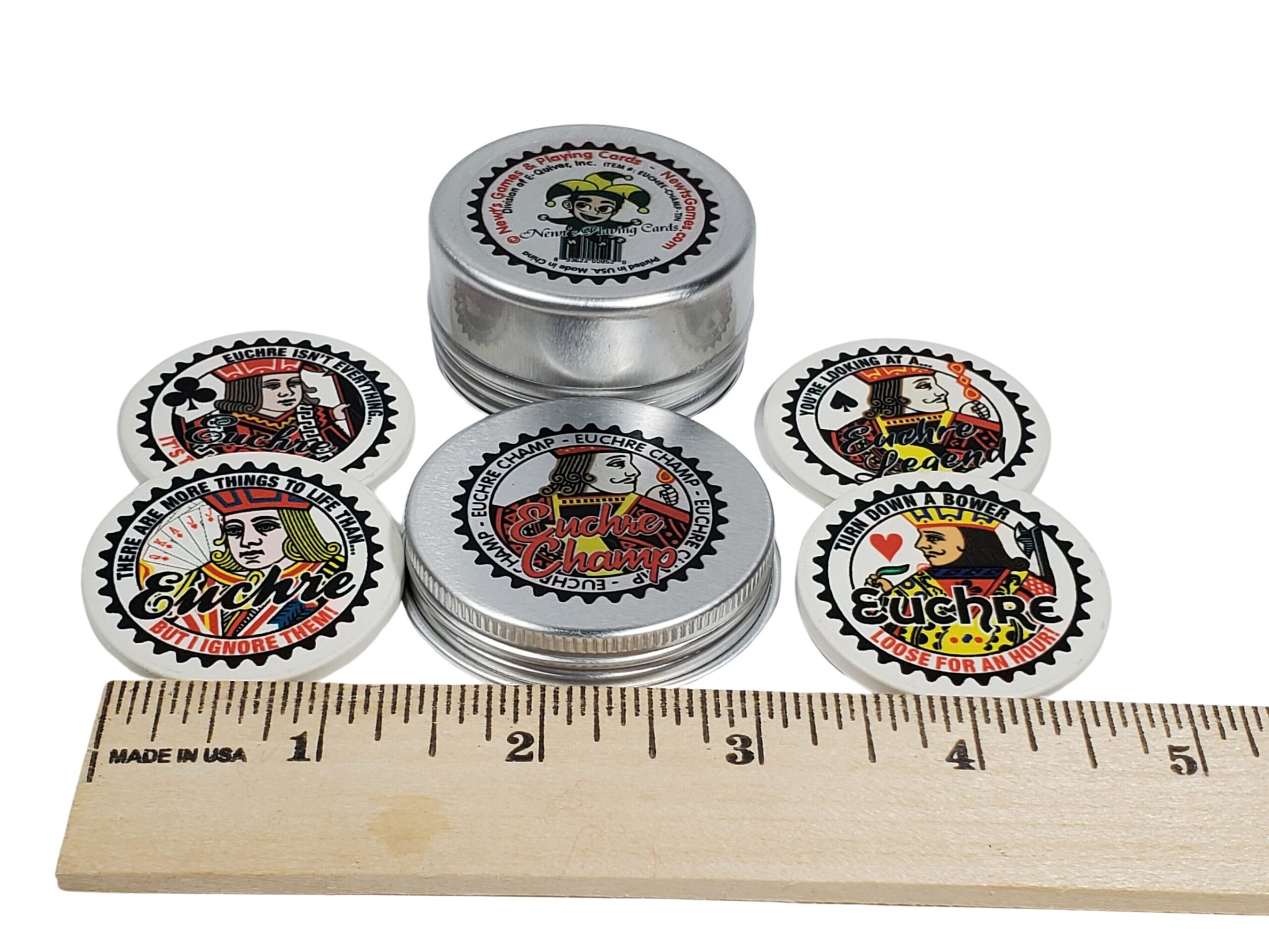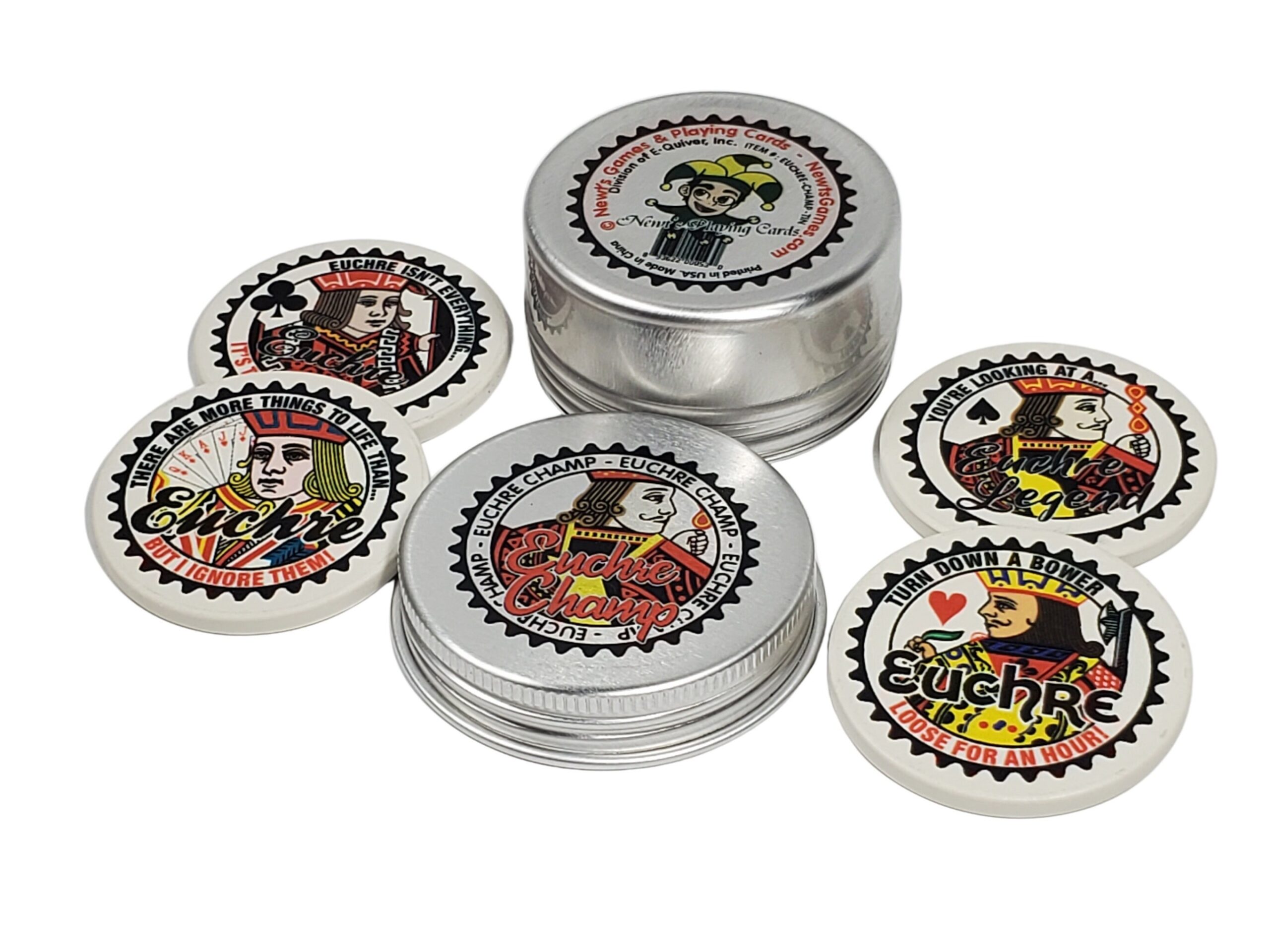 Great gift idea for the euchre fan in your life, or even as an award for an euchre tournament. Set includes 4 ceramic poker chips with popular euchre sayings like: