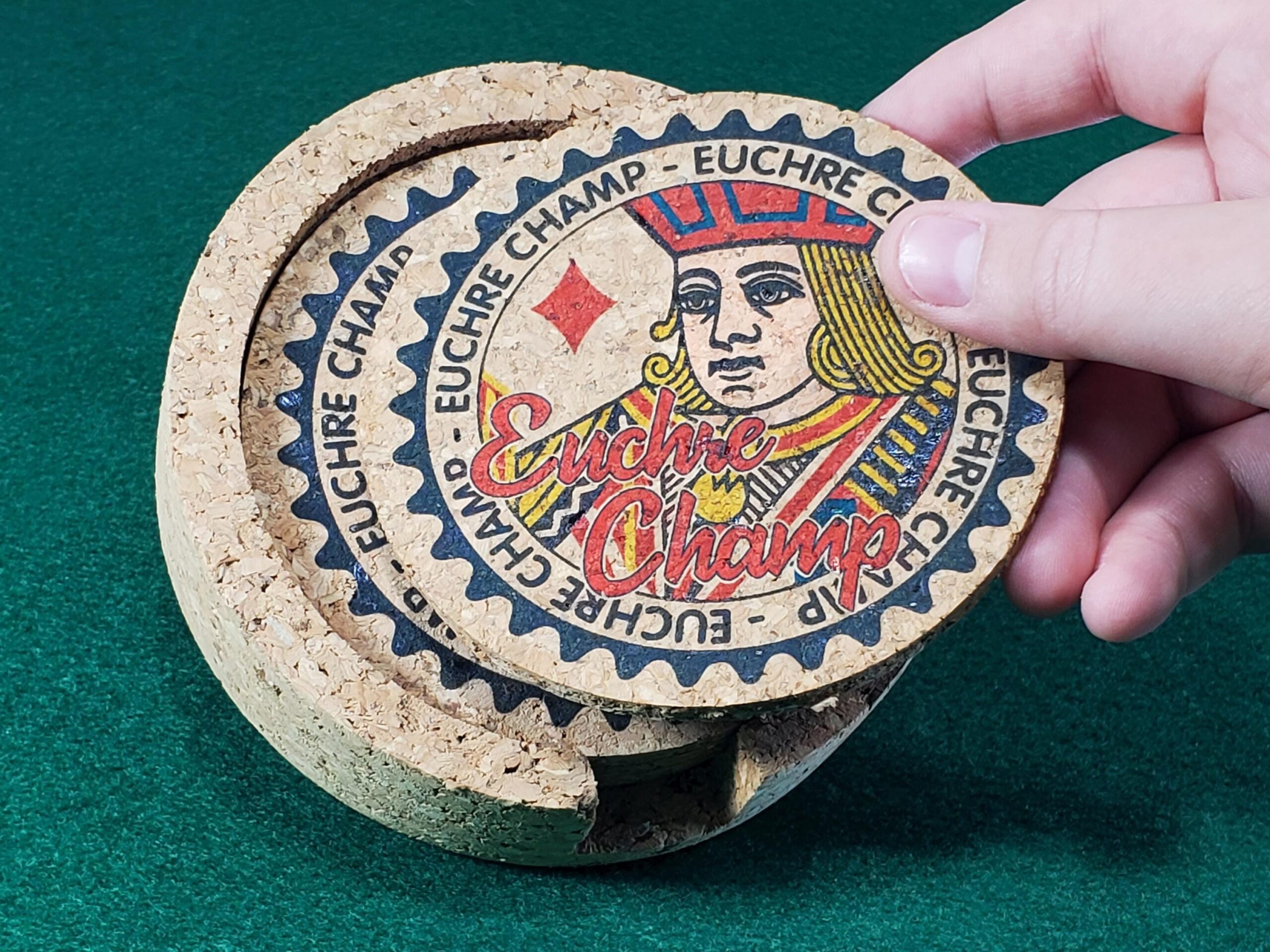 Protect your coffee or end table from stains and spills with our “Corked Euchre Champ Coaster Set” not only make a perfect gift for the euchre card player in your life, but they are the perfect gift to yourself! These decorative coasters are made of absorbent cork that give you great protection from drinks like coffee, tea, beer, soda pop and more. Each coaster features a design centered around your favorite card game. Your set also includes a cork coaster holder to help keep your coasters neatly stacked. Perfect for your next card night, or use them for everyday use.