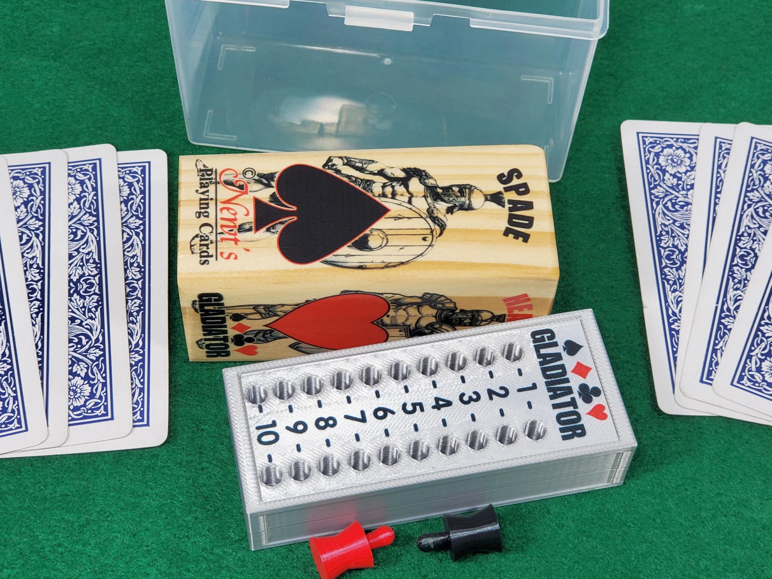 Here’s something a little different for your next euchre night. Our “Gladiator Suited Marker and Scorekeeper Gift Set” is perfect for the avid euchre player. Okay, we may be bias, but we think it is so cool with the gladiators on the trump block. Then we used special plastic to get a shiny scorekeeper that allows you to keep track of points during card playing. Shoot, it even comes packed in a convenient plastic box. Small, packed together and compact making it perfect for traveling or just to take to your next euchre card night.