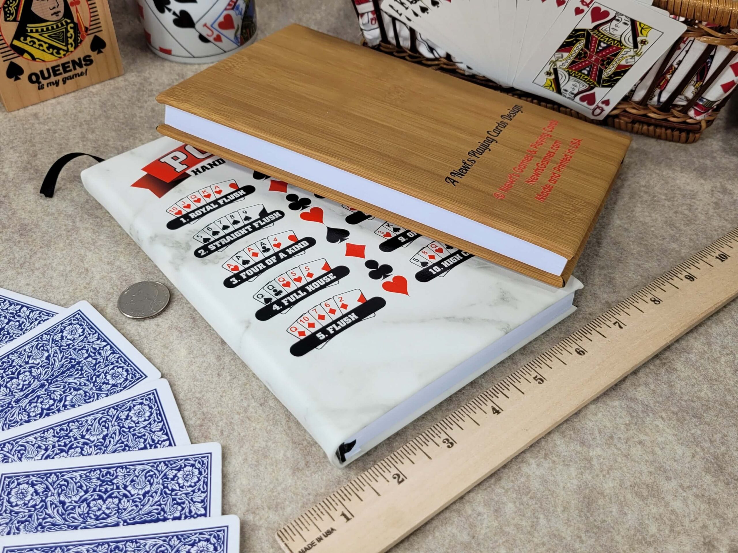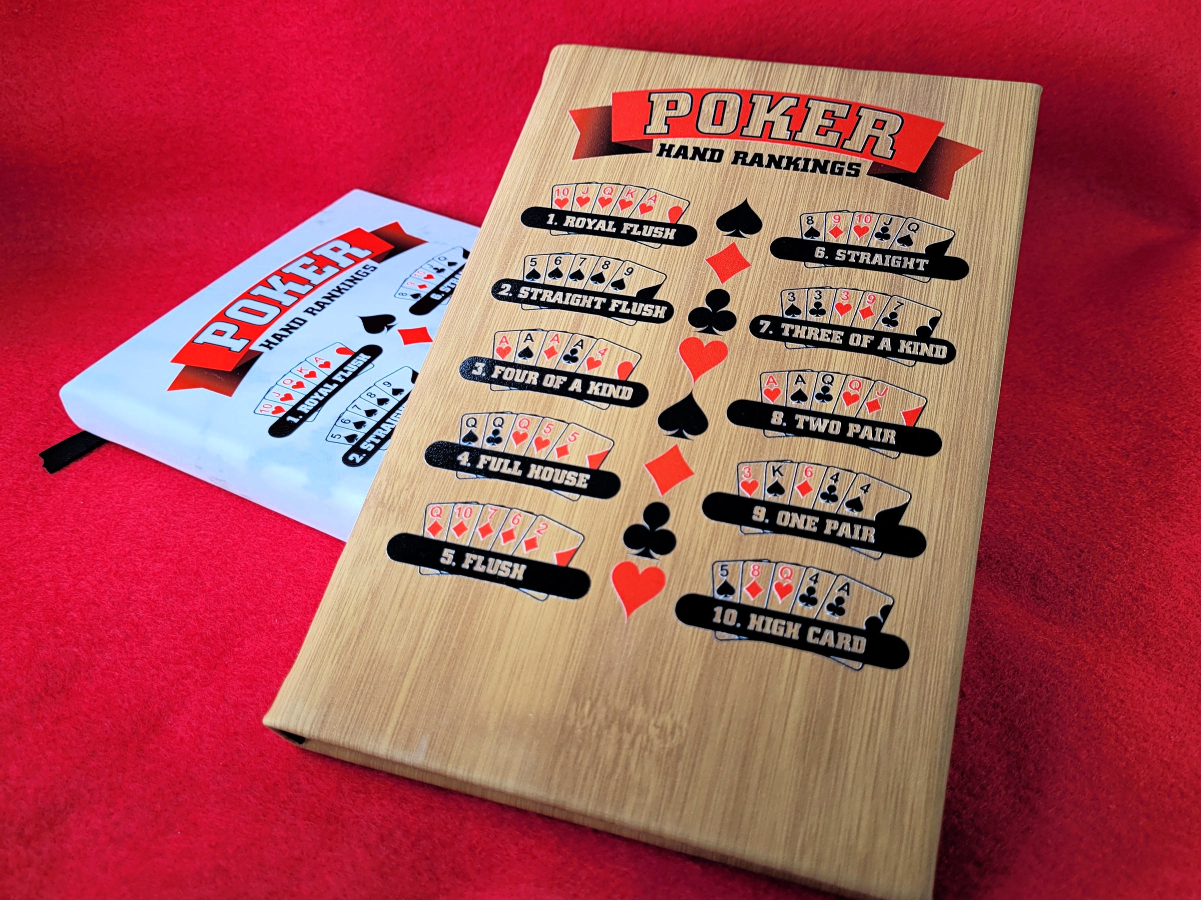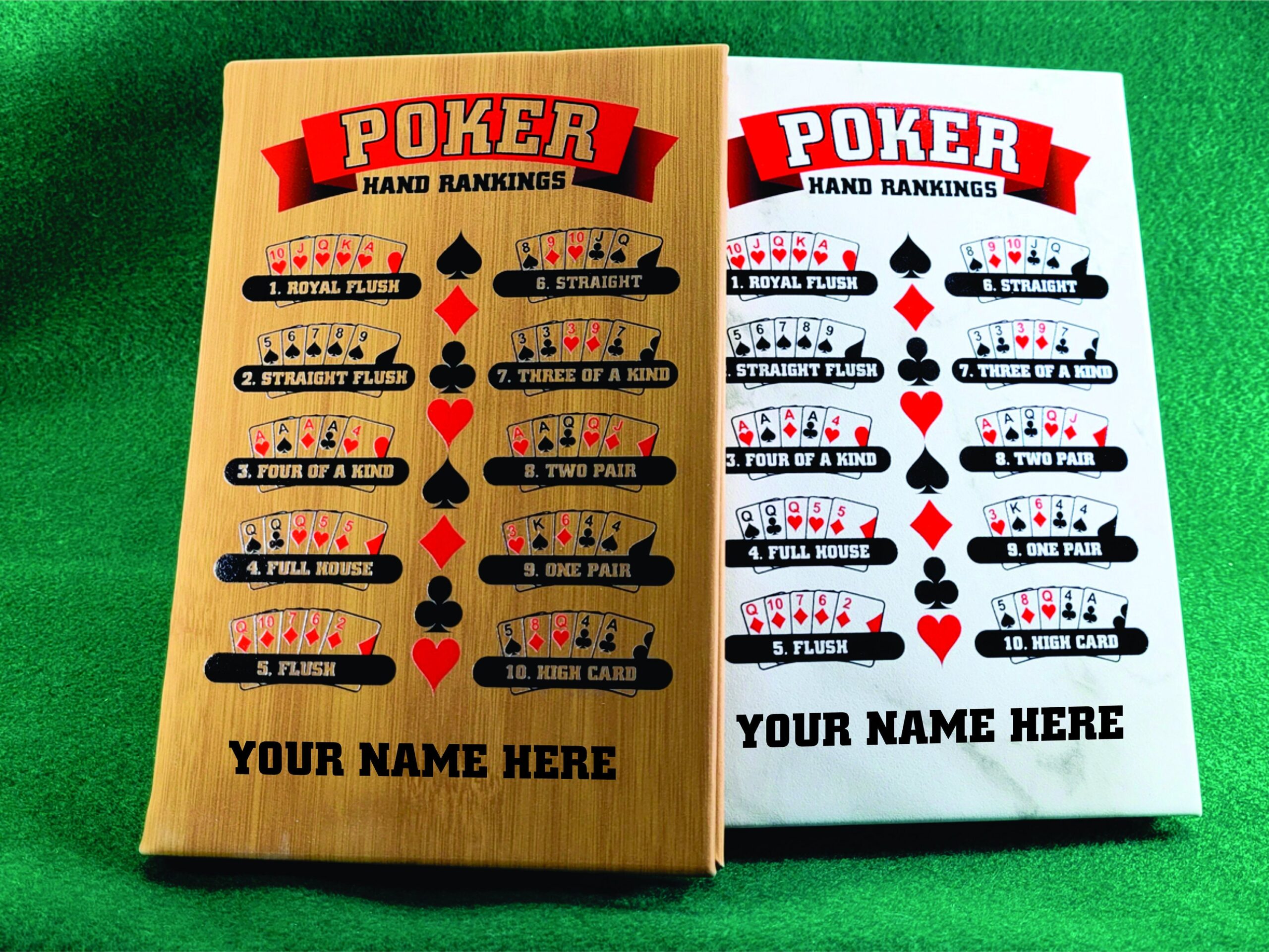 Our “Gambling Poker Journal” is a leatherette book that has a list of poker hand rankings printed on the front with blank, no-line sketch pages inside. You can even add your name on the front bottom of the book. The journal is a great gift idea for the poker enthusiast or player! Keep track of how much money you’ve won off your friends and family, draw the reaction of their faces as they lose, or just record your own notes with this stylized journal! Either way, it’s a great reminder on how poker hands rank.