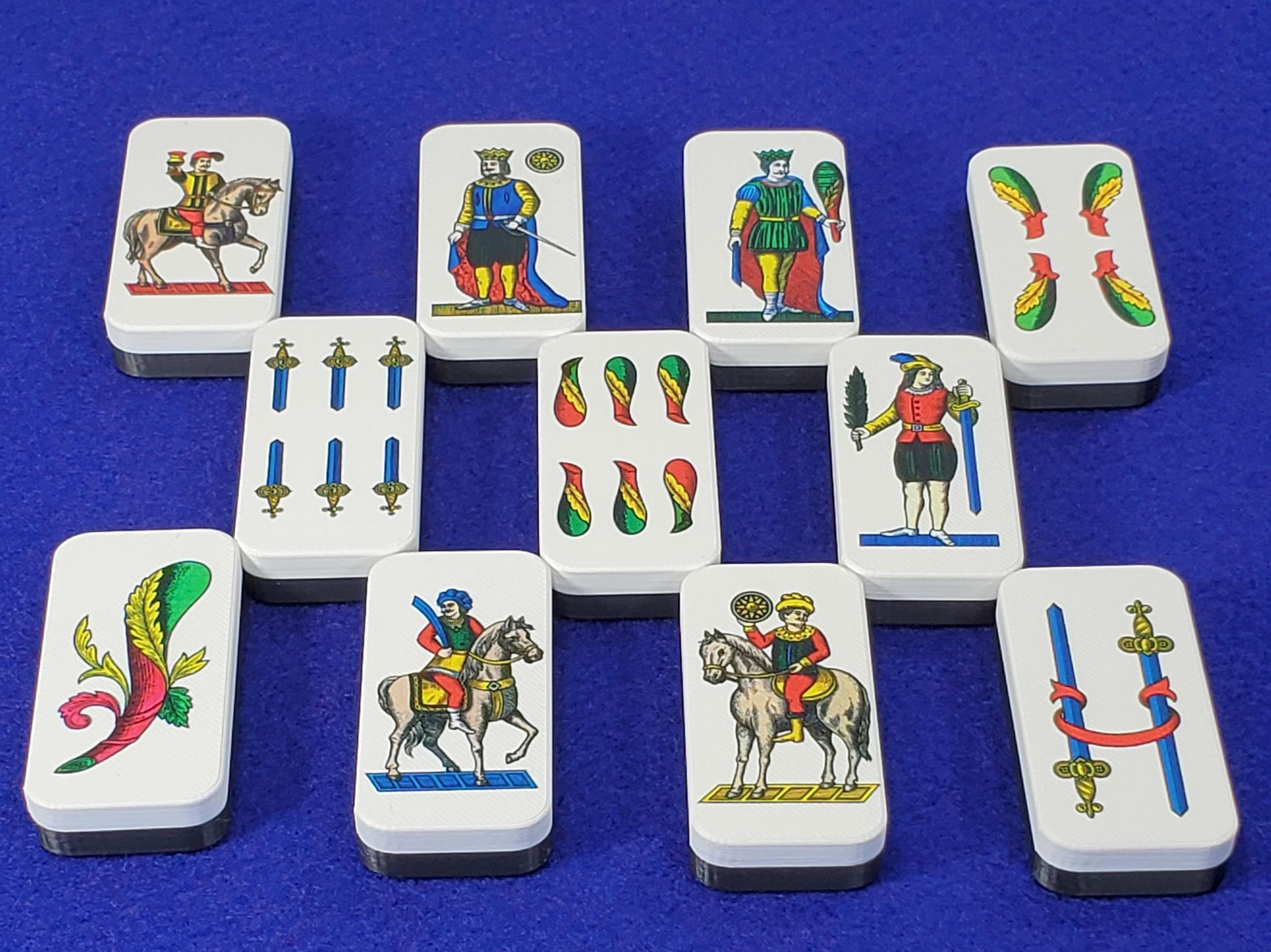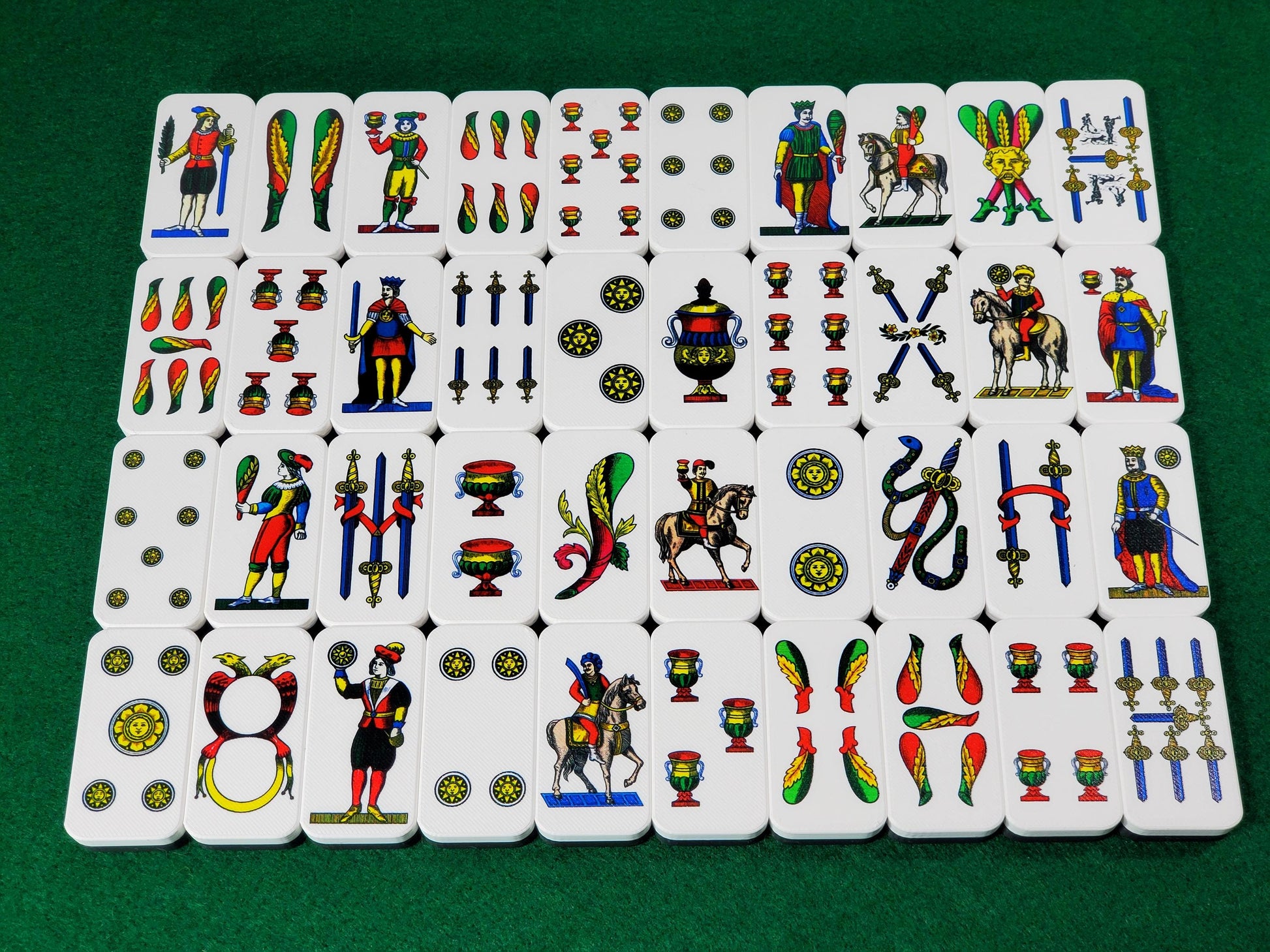 Includes 40 cards based on art from a vintage "Naples" playing cards deck that is digitally cleaned up by CharkaGallery, with an attempt to keep their originality. Colors were repaired and the deficiencies and sharpened. Then Newt's Games uses a special UV to put the images directly on to the dominoes to give them a long-lasting life.
